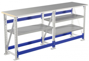 Основные элементы изготовлены из оцинкованной стали, что позволяет использовать верстак в условиях повышенной влажности. Столешница выполнены из 24 мм фанеры, покрытой листом металла толщиной 1,5 мм. Выдерживают распределенную нагрузку до 300 кг. Для столярных нужд столешницы можно заменить на фанерные (М-100), без покрытия стальным листом.