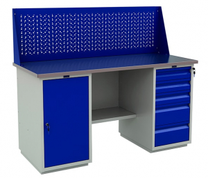 WT160.WD1/WD5.010 — двухтумбовый слесарный верстак с перфорированным экраном. Предназначен для организации рабочего места на производстве, в учебных заведениях, мастерских и гаражах. Изделие имеет сертификат соответствия ГОСТ 16371-2014.